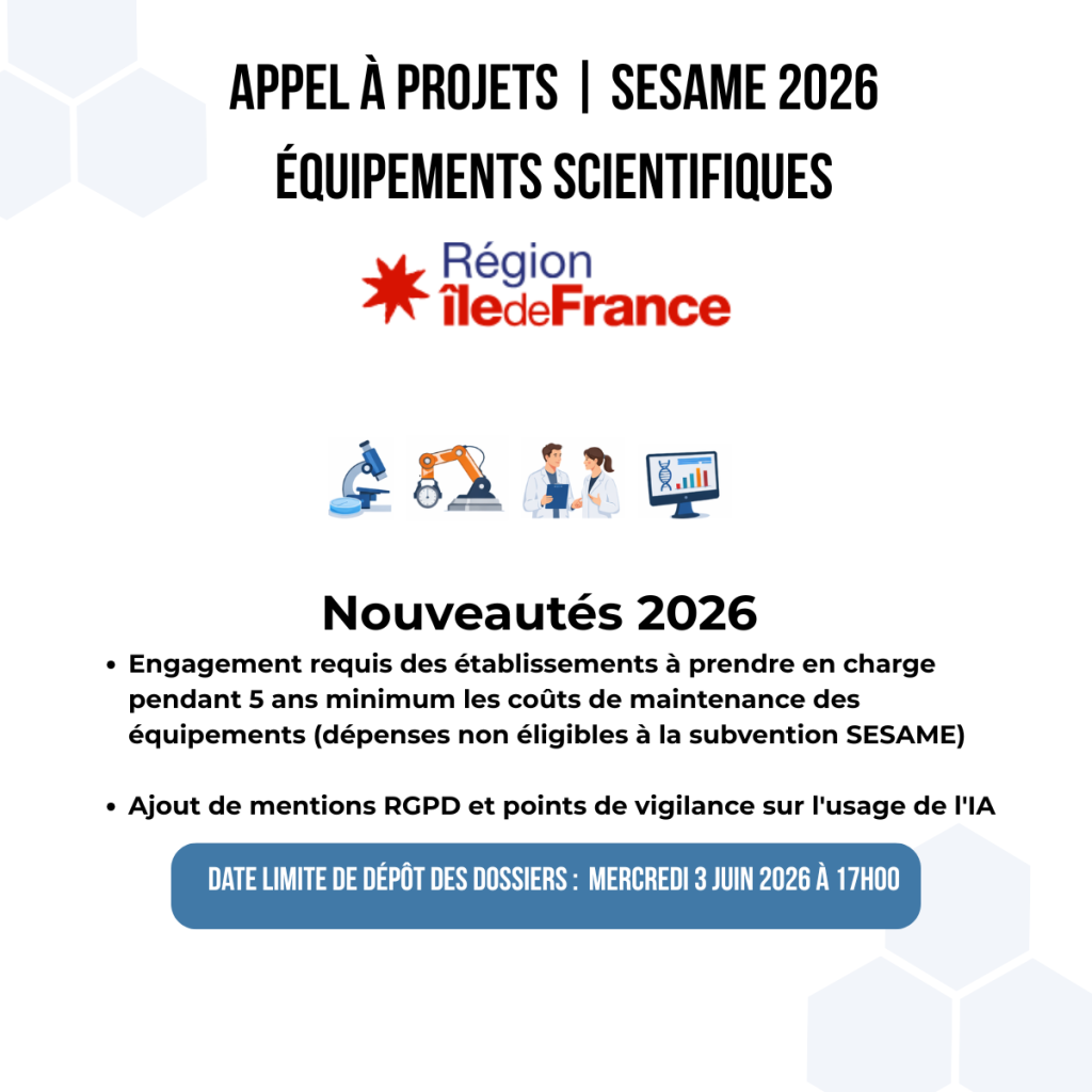 La Région Île-de-France lance l’édition 2026 du Programme SESAMEÉquipements et plateformes scientifiques et technologiques. Cet appel vise à soutenir l’acquisition d’équipements scientifiques structurants et le développement de plateformes technologiques au sein des laboratoires franciliens.
